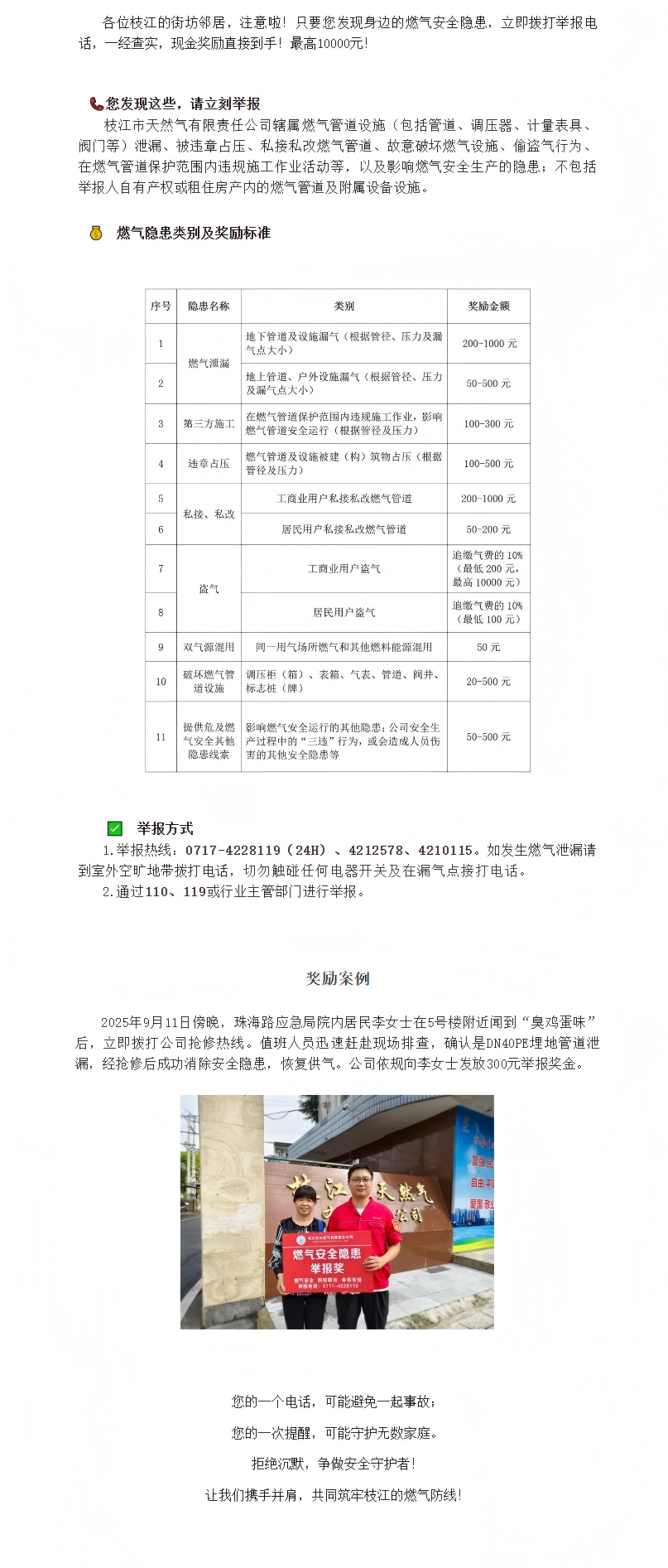 @枝江街坊 發(fā)現(xiàn)燃?xì)怆[患,馬上打電話!現(xiàn)金獎勵等你拿→